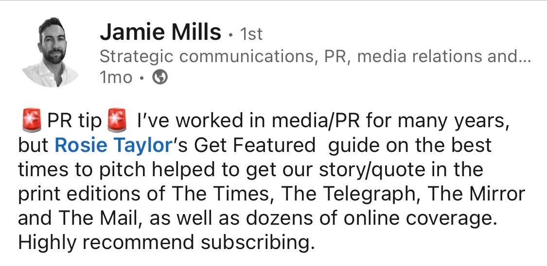 For those of you who are new here, I’m Rosie Taylor, an award-winning freelance journalist and every Monday I send out this Get Featured newsletter, sharing advice on how to successfully pitch to the UK national media.